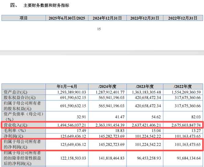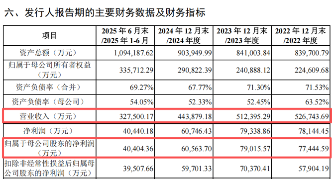 2022年至2024年及2025年上半年,振石股份的营业收入分别为52.67亿元、51.24亿元、44.39亿元及32.75亿元,归母净利润分别为7.74亿元、7.90亿元、6.06亿元及4.04亿元。