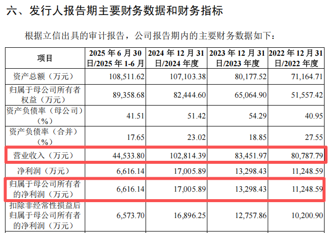 2022年至2024年及2025年上半年,世盟股份的营业收入分别为8.08亿元、8.35亿元、10.28亿元及4.45亿元,归母净利润分别为1.12亿元、1.33亿元、1.70亿元及6616.14万元。