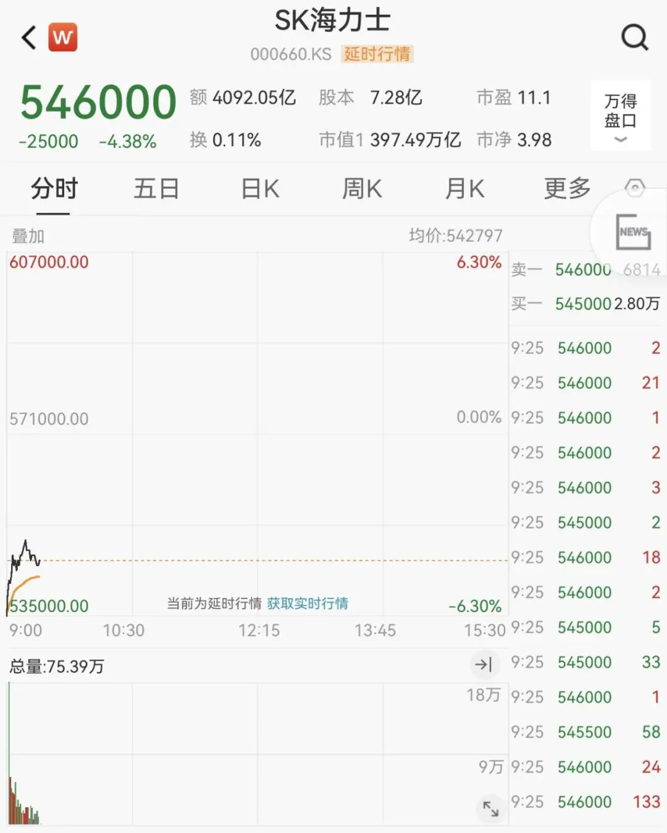 个股方面,SK海力士领跌韩国芯片股,追随华尔街上周五跌势。SK海力士股价下跌4.38%,至54.6万韩元,三星电子、现代建设、斗山集团等跌幅居前。