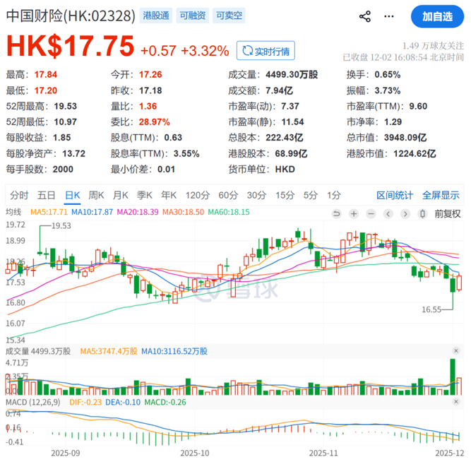 12月2日,港股中国财险股价有所回升,截至收盘报17.75港元/股,总市值为3948.09亿港元。