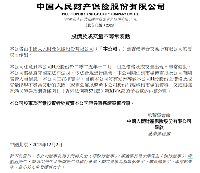 12月2日晚间,人保财险在港交所发布公告称,其注意到公司H股股份于2025年12月1日的价格及成交量出现不寻常波动。