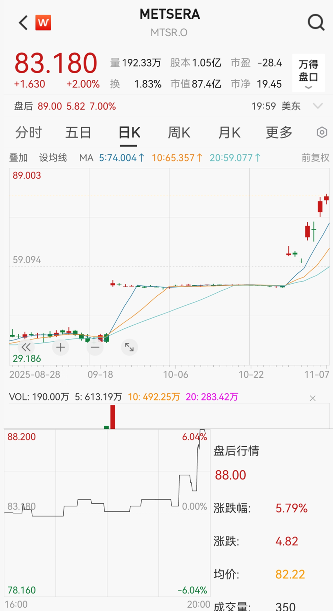 凭借其颠覆性的技术平台与差异化管线,Metsera成为全球代谢疾病领域最具潜力的挑战者之一。2024年完成A轮和B轮融资后,Metsera于2025年1月在纳斯达克上市。截至11月7日收盘,Metsera股价为83.18美元/股,总市值升至87.4亿美元。