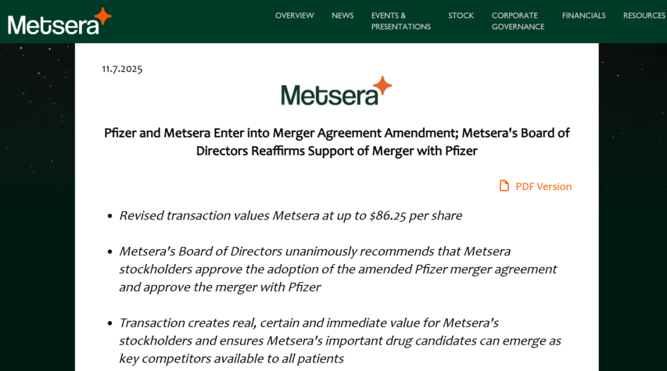 当地时间11月7日,Metsera宣布,其已与辉瑞签订了修订后的合并协议。根据该协议,辉瑞将以每股最高86.25美元的价格收购Metsera,其中包括每股65.60美元的现金和或有价值权(CVR),持有人有权额外支付每股高达20.65美元的现金。