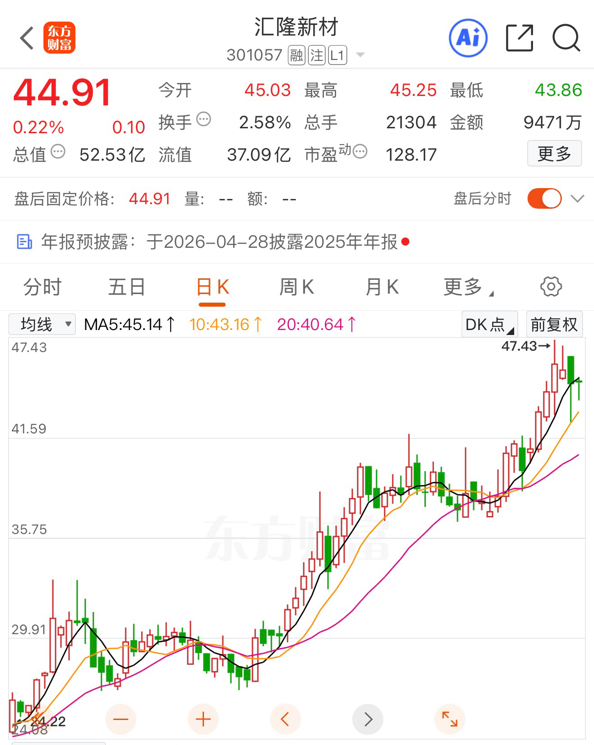 截至2月25日收盘,汇隆新材报收于44.91元/股,最新市值为52.53亿元。