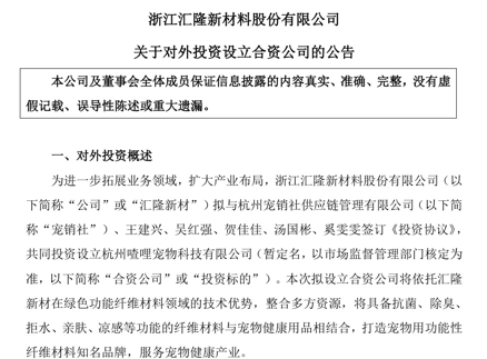 汇隆新材表示,宠物行业具有良好的发展前景,合资公司将依托汇隆新材在绿色功能纤维材料领域的技术优势,整合多方资源,将具备抗菌、除臭、拒水、亲肤、凉感等功能的纤维材料与宠物健康用品相结合,打造宠物用功能性纤维材料知名品牌,服务宠物健康产业。
