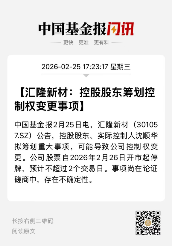 【导读】汇隆新材筹划易主,2月26日开市起停牌