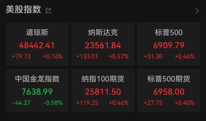 截至收盘,标普500指数上涨0.46%,报6909.79点;道琼斯指数上涨0.16%,报48442.41点;纳斯达克综合指数上涨0.57%,报23561.84点。