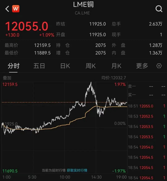 黄金创下新高后,铜价也创下新高。LME铜突破12000美元/盎司。