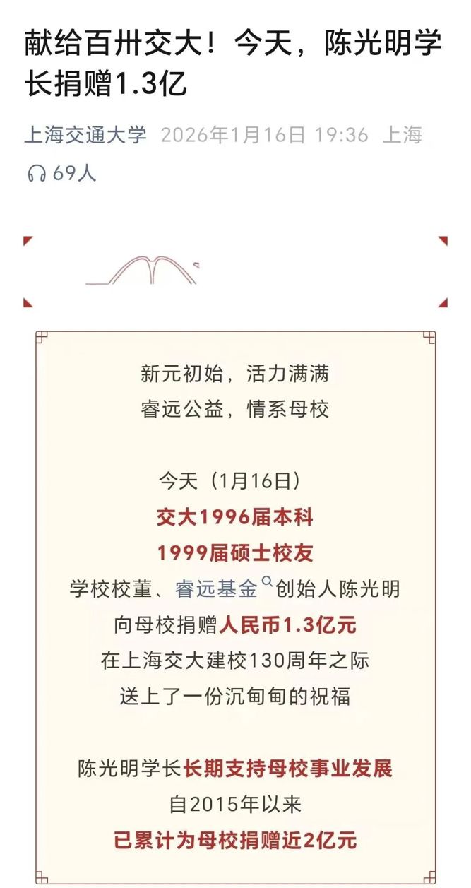1月16日,睿远基金创始人陈光明携睿远基金、睿远公益基金会向上海交大捐赠1.3亿元,覆盖医疗帮扶、科研创新、前沿人才培育等领域。自2015年以来。陈光明已累计为上海交大捐赠近2亿元,支持交大事业发展。