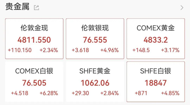 消息面上,现货黄金突破4800美元/盎司,日内涨2.34%;现货白银突破76美元/盎司,日内涨4.96%。