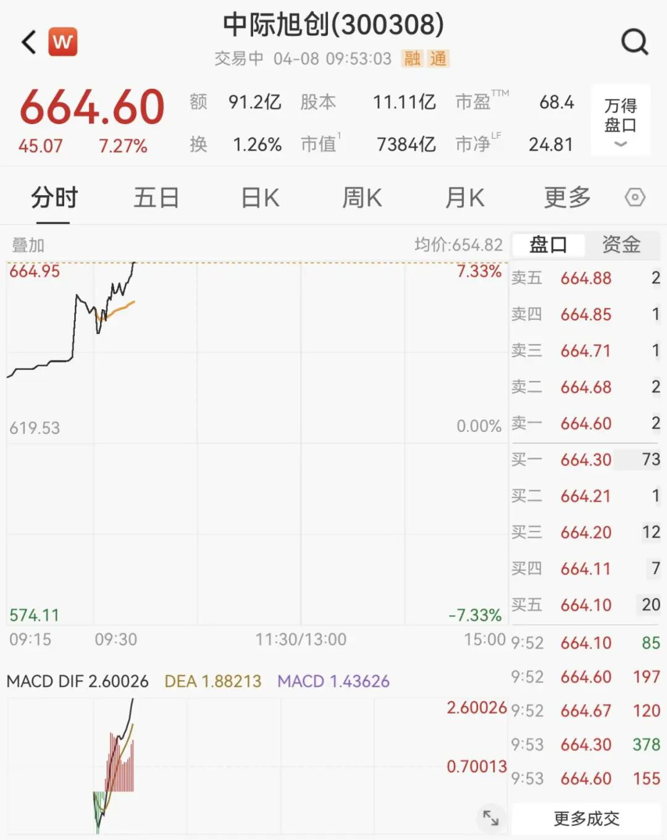 中际旭创盘中涨超7%,刷新历史高点,总市值突破7300亿元。