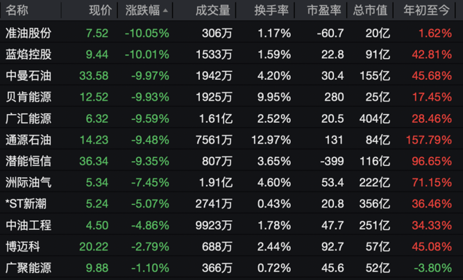 油气板块大幅低开,准油股份、蓝焰控股、中曼石油等多股跌停,贝肯能源、广汇能源、通源石油等跟跌。