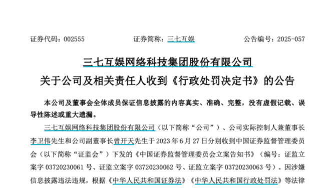 【导读】七年信披违规,三七互娱及相关责任人合计被罚3255万元