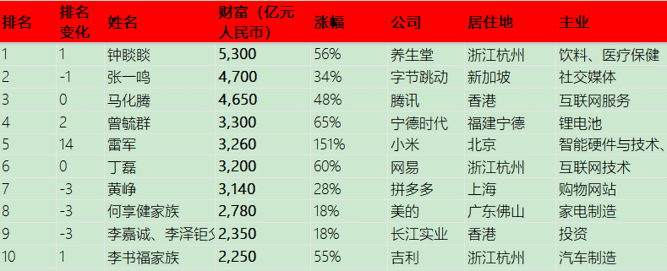在新能源汽车及电池行业,受益于政策利好与全球市场需求的双轮驱动,雷军的财富增长1960亿元,宁德时代曾毓群以3300亿元财富进入榜单前五名。