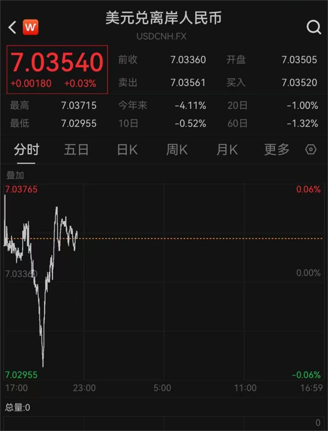 其中,离岸人民币对美元汇率一度击穿7.03,早间一度升至7.02955,创2024年10月1日来新高。截至发稿,人民币对美元汇率报7.03540。