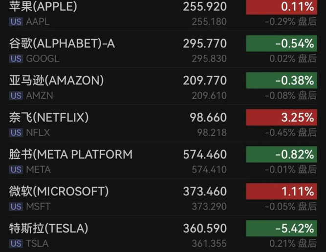 大型科技股涨跌互现,特斯拉跌超5%,脸书跌0.82%,亚马逊跌0.38%,谷歌跌0.54%,微软涨超1%,苹果涨0.11%。