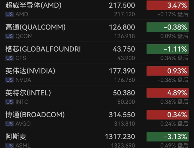 芯片股涨跌不一,费城半导体指数涨0.4%,英特尔涨近5%,超威半导体涨逾3%,英伟达涨近1%,ARM跌超3%,阿斯麦跌逾3%,拉姆研究跌超1%,应用材料跌逾1%。