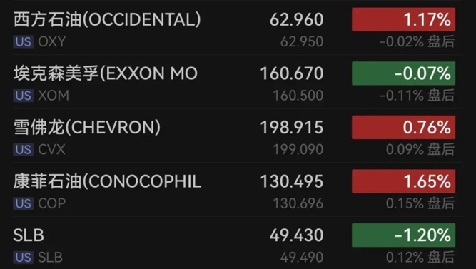 能源股涨跌不一,埃克森美孚跌0.07%,雪佛龙涨0.76%,康菲石油涨超1%,斯伦贝谢跌逾1%,西方石油涨超1%。