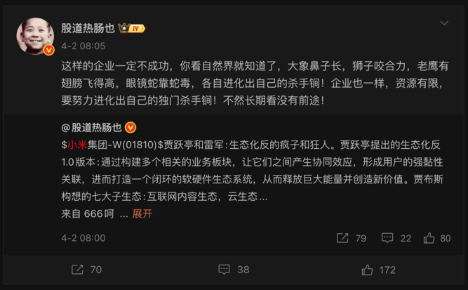 百亿元级私募日斗投资创始人、董事长王文(微博名:股道热肠也)4月1日、2日连续在微博公开表达对小米的质疑。他指出,小米涉足多个行业,但鲜有领域跻身行业前三;在现有业务尚未做精做强之际,又转向AI、机器人等热门赛道,怀疑小米缺乏清晰长期规划,存在追热点倾向。他强调,企业需打造核心竞争力,否则长期发展缺乏支撑。