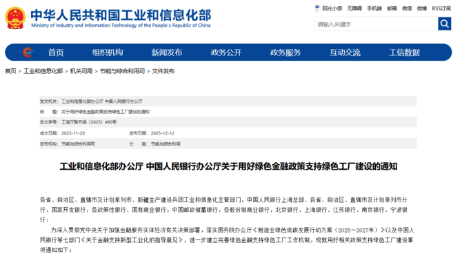 12月12日,工业和信息化部办公厅、中国人民银行办公厅发布关于用好绿色金融政策支持绿色工厂建设的通知(以下简称通知)。