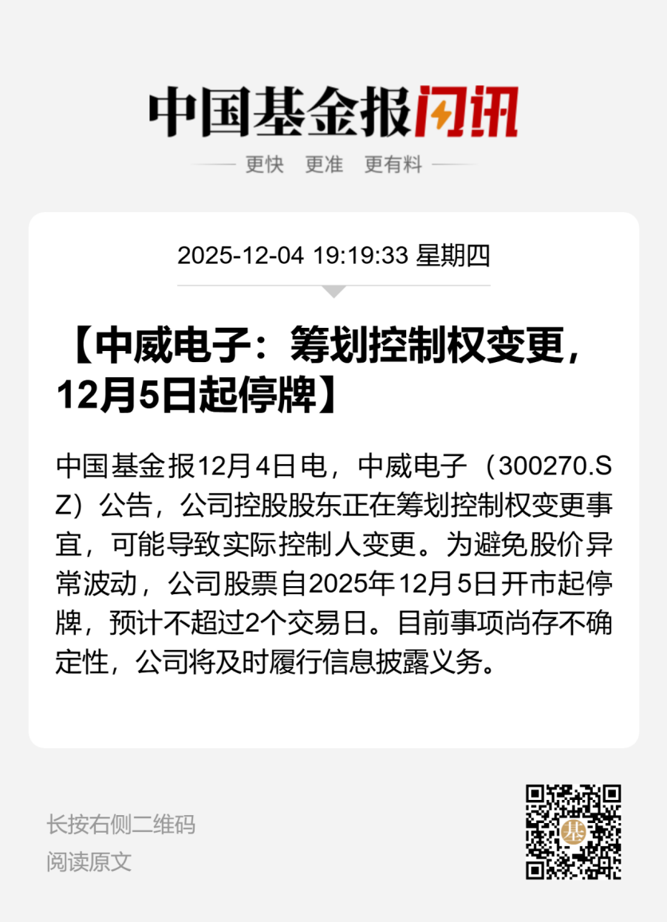 中威电子12月4日晚发布公告称,公司于2025年12月4日收到控股股东新乡市新投产业并购投资基金壹号合伙企业(以下简称新乡产业基金壹号)的通知,获悉其正在筹划公司控制权变更事宜,该事项可能导致公司实际控制人发生变更。