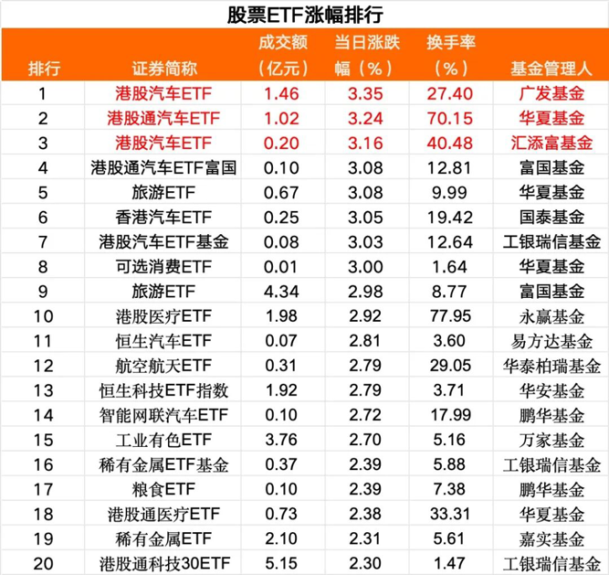从股票ETF二级市场表现看,港股汽车领涨。当日港股汽车ETF(广发)、港股通汽车ETF(华夏)、港股汽车ETF(汇添富)、港股通汽车ETF富国、旅游ETF(华夏)、香港汽车ETF(国泰)、港股汽车ETF基金(工银瑞信)领涨,涨幅均超3%。