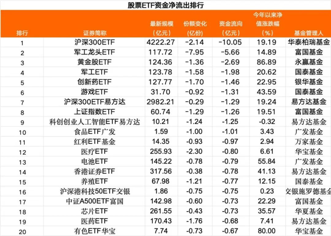 在股票ETF中,当日10只股票ETF净流出超过1亿元,沪深300指数、上证指数等宽基ETF,以及军工龙头、黄金股、创新药等行业主题ETF是资金净流出较多的品种。