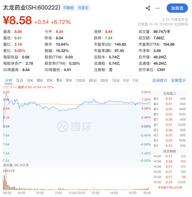 截至12月1日收盘,太龙药业股价报8.58元/股,总市值为49.24亿元。