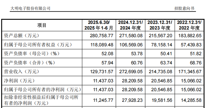 2022年至2024年及2025年上半年,大明电子的营业收入分别为17.13亿元、21.47亿元、27.27亿元及12.97亿元,归母净利润分别为1.51亿元、2.05亿元、2.82亿元及1.14亿元。