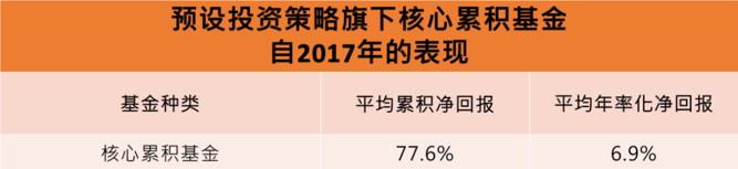值得一提的是,2017年推出的预设投资策略(default investment strategy(DIS),懒人基金)广受欢迎。该策略采取分散投资原则,设有收费上限,自推出以来,DIS旗下核心累积基金平均录得6.9%的年化净回报率。
