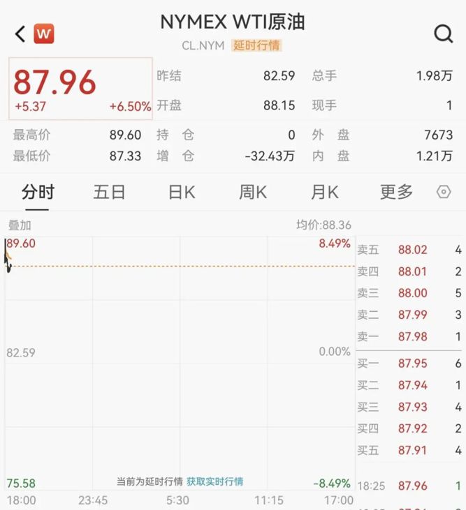 4月20日,受伊朗再次关闭霍尔木兹海峡的影响,原油期货开盘大涨,WTI原油期货一度涨超8%,现报87.96美元/桶。