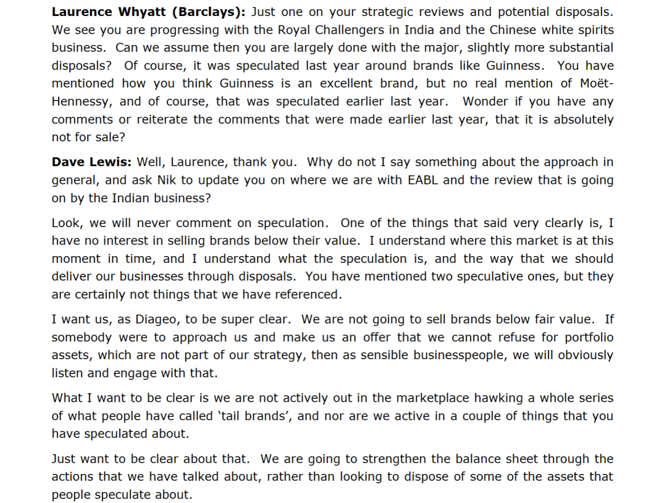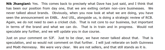 帝亚吉欧首席财务官Nik Jhangiani补充表示,帝亚吉欧退出部分非核心业务,但从未讨论过出售品牌。公司态度明确,不会贱卖任何资产。“关于出售水井坊,我明确一点:我们从未讨论过此事,纯属市场猜测,因此不再进一步置评。”他说。