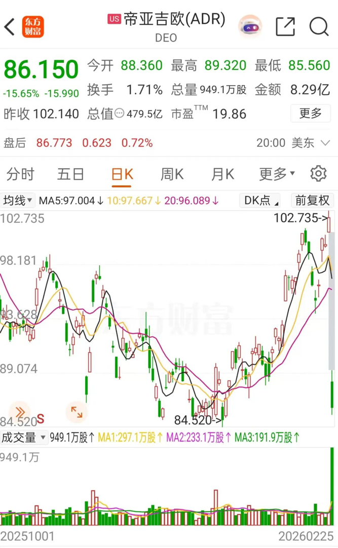 受上述多重利空因素影响,帝亚吉欧在美股市场遭遇重挫。截至2月25日收盘,其股价报86.15美元/股,单日跌幅高达15.65%,市值已缩水至约480亿美元。