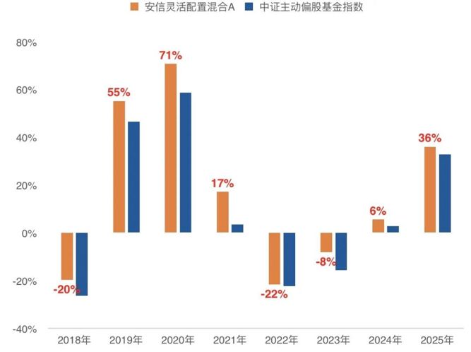 安信灵活配置A自2012年度至2025年度的完整年度业绩/业绩比较基准增长率分别为:7.70%/-1.06%(自生效)、4.83%/-6.19%、41.60%/32.73%、23.85%/7.11%、-17.61%/-7.07%、10.27%/10.74%、-19.61%/-13.54%、55.23%/21.41%、70.80%/16.22%、17.18%/-1.88%、-21.54%/-13.11%、-8.03%/-6.17%、5.57%/11.50%、36.06%/9.55%;基金成立日:2012-06-20;本基金历任基金经理为:陈振宇(20120620-20140115)、黄立华(20140115-20151201)、占冠良(20151201-20180115)、张竞(20171229至今)。