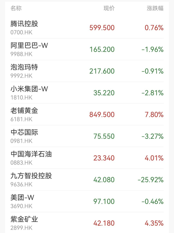 盘面上,大型科技股涨跌不一,京东涨超1%,百度、快手跌超3%,小米跌超2%,阿里巴巴跌超1%;石油股强势,中石油涨超3%;金价高涨,黄金股普涨,中国黄金国际涨超8%;有色金属股普涨,洛阳钼业涨超6%,山东黄金、紫金矿业涨超4%。