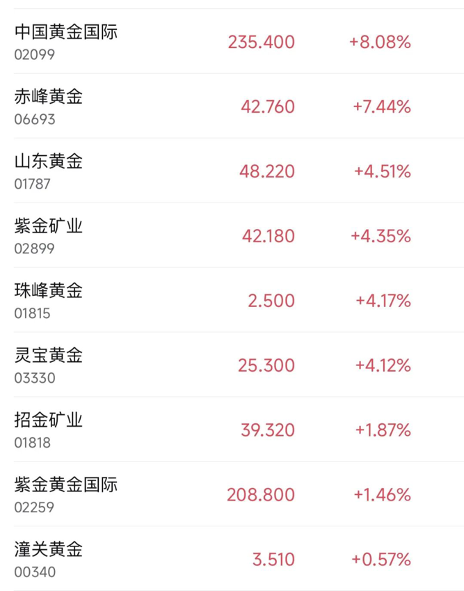 黄金股普涨,中国黄金国际涨超8%,赤峰黄金涨超7%,山东黄金、紫金矿业、灵宝黄金涨超4%,招金矿业、紫金黄金国际涨超1%。