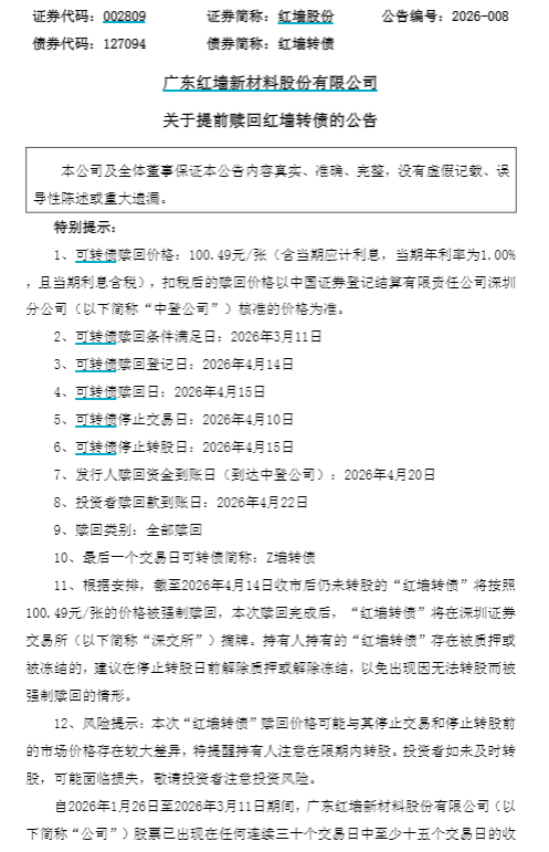 来源:集思录、Wind红墙转债自4月10日停止交易。截至4月9日收盘,红墙转债二级市场价格为104.132元/张。