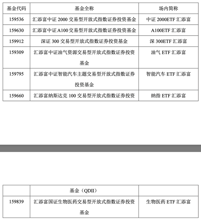 汇添富基金也于同日公告修改上交所上市的10只ETF及深交所上市的7只ETF场内扩位简称。