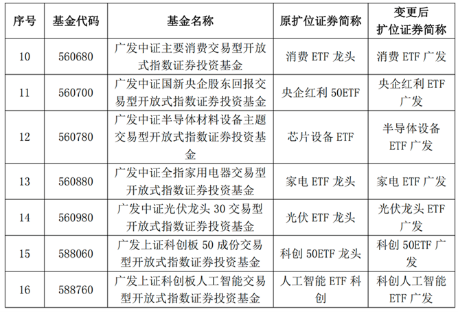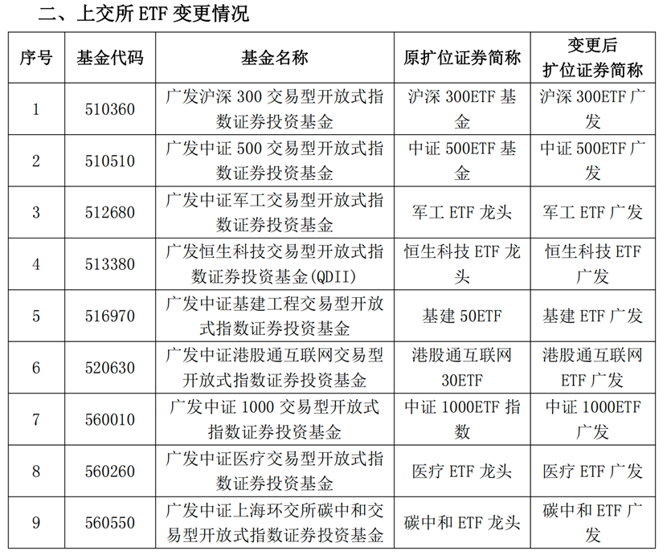 例如,广发基金于12月29日公告,经向上海证券交易所、深圳证券交易所申请并获得同意,广发基金决定自12月30日起变更旗下部分ETF的场内简称、扩位证券简称。其中,涉及深交所上市的3只ETF以及上交所上市的16只ETF。