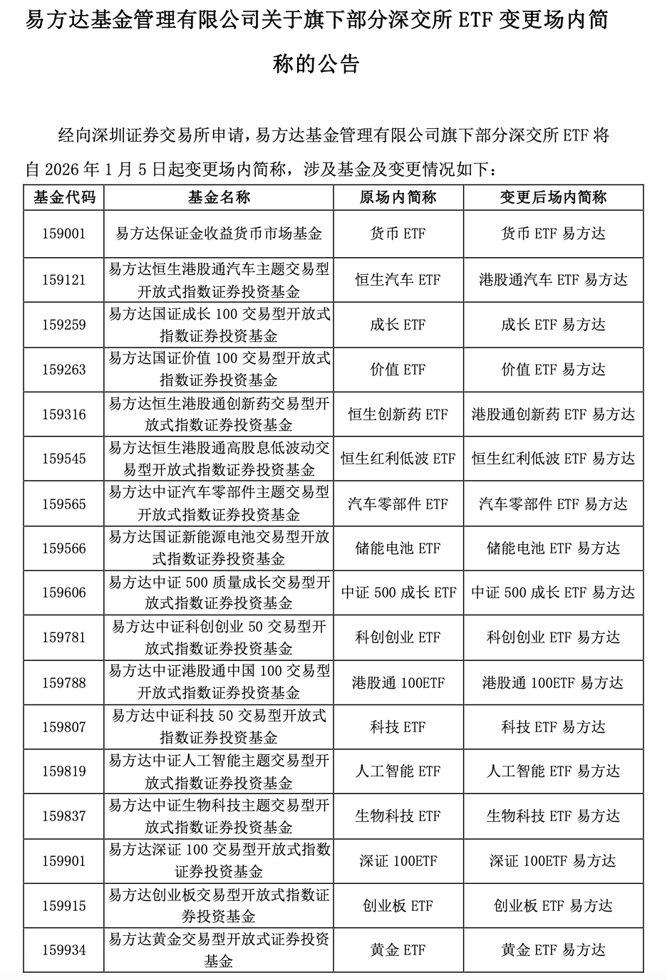 日前易方达基金宣布,经向上海证券交易所申请,易方达基金旗下部分上交所ETF将自2026年1月5日起变更扩位证券简称,涉及多只ETF产品。