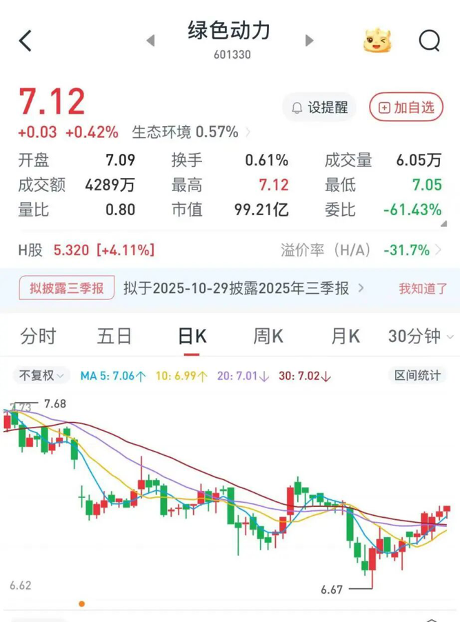 从财报数据来看,截至2025年6月末,绿色动力实现收入16.84亿元,归母净利润为3.77亿元。同时,截至10月15日收盘,绿色动力报7.12元/股,总市值为99.21亿元。