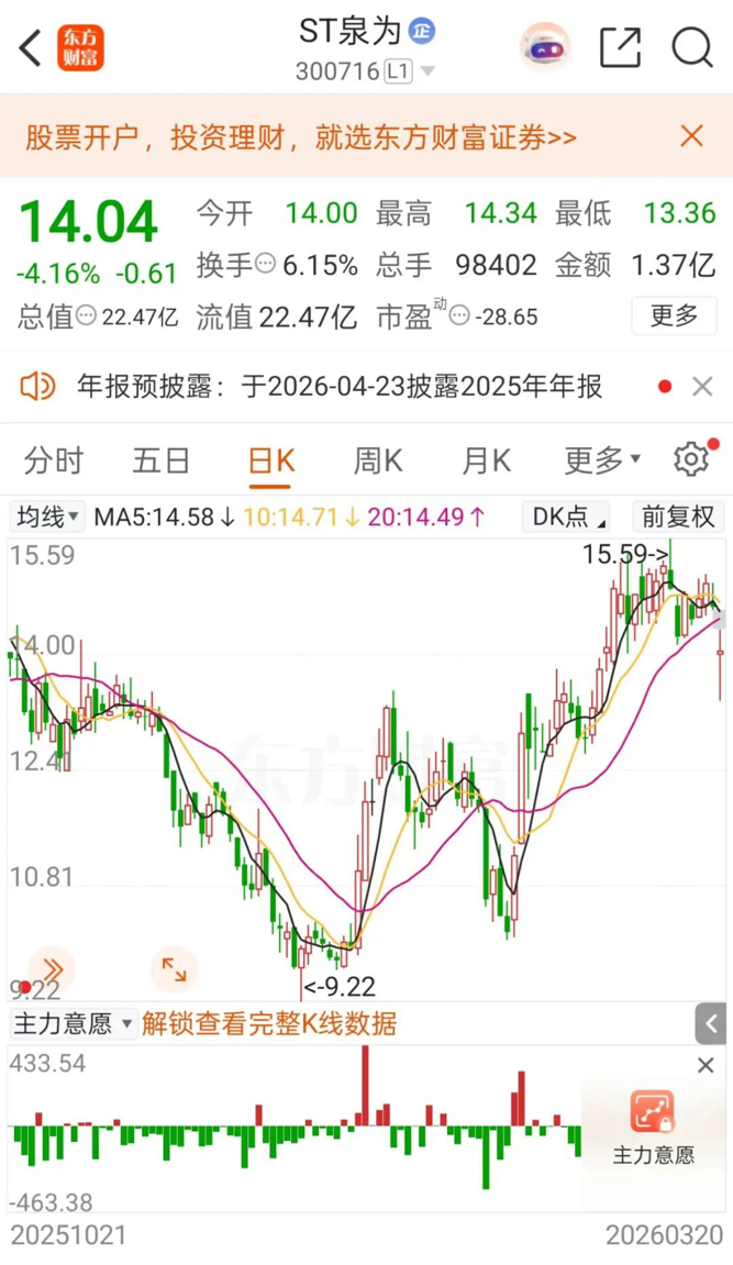受此消息影响,今日ST泉为股价开盘大跌4.44%。截至记者发稿,ST泉为报14.04元/股,下跌4.16%,总市值为22.47亿元。