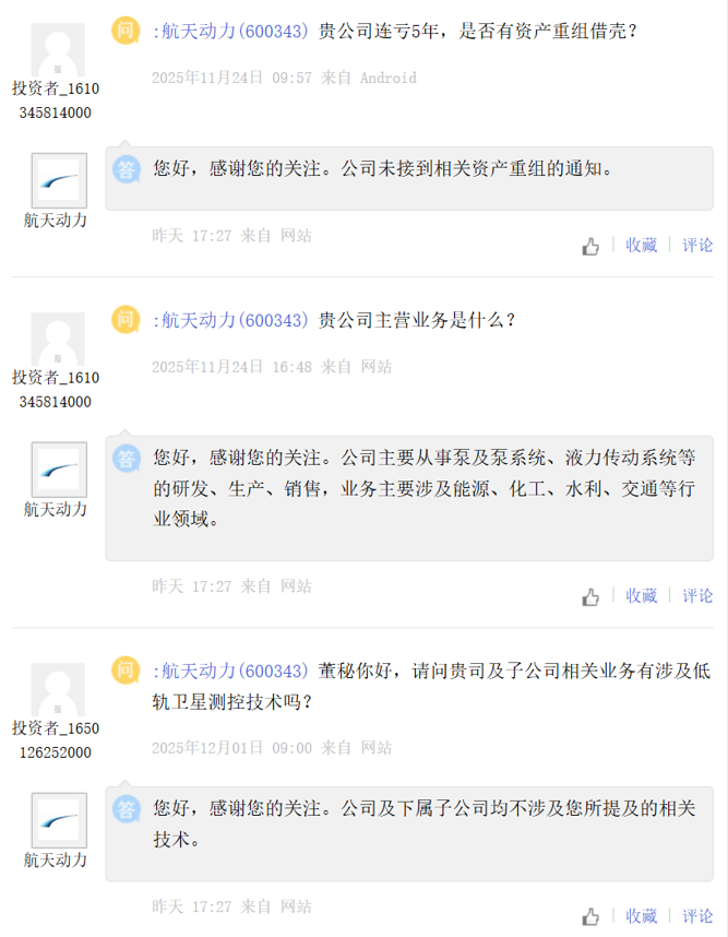12月2日,航天动力在投资者互动平台上回复多个问题。航天动力提到,公司及下属子公司均不涉及低轨卫星测控相关技术,公司未接到相关资产重组的通知等。