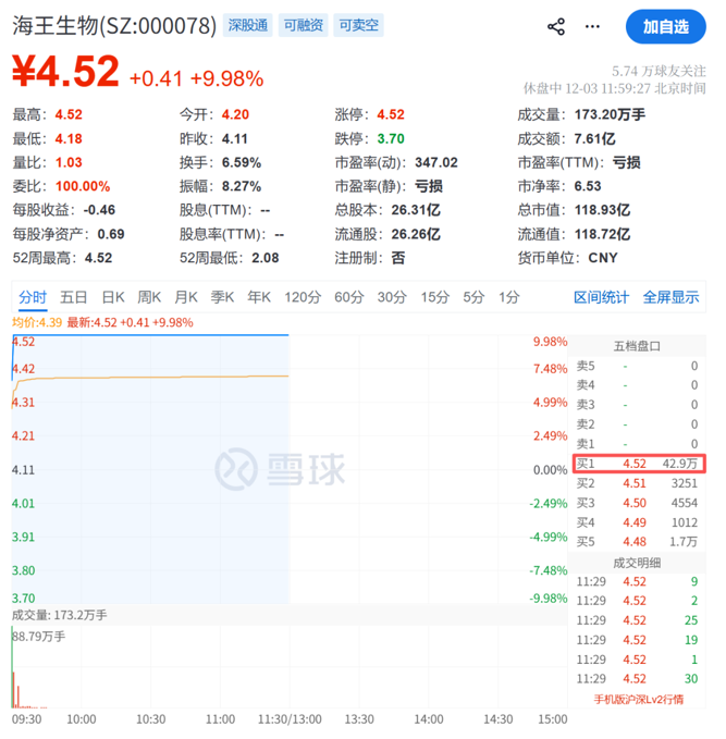 12月3日上午,A股医药商业板块走高,抗流感概念股反复活跃。海王生物走出6连板,买一封单近43万手;瑞康医药、益盛药业等涨停,粤万年青、人民同泰等跟涨。