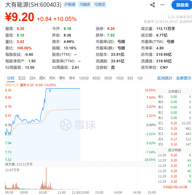 12月3日上午,煤炭板块盘中发力,大有能源、安泰集团、新大洲A等直线拉升涨停,云煤能源、电投能源等跟涨。