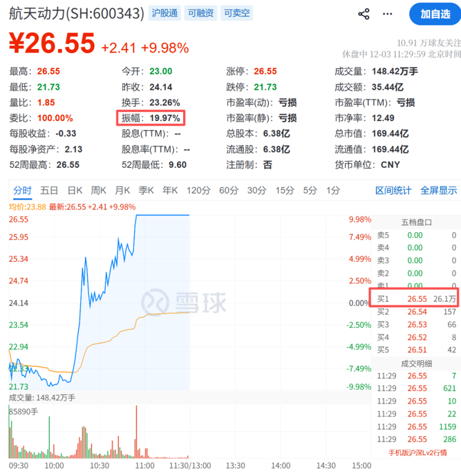 截至午间收盘,航天动力仍保持涨停状态,股价报26.55元/股,总市值为169亿元;半日成交额达35.44亿元,买一封单超26万手。
