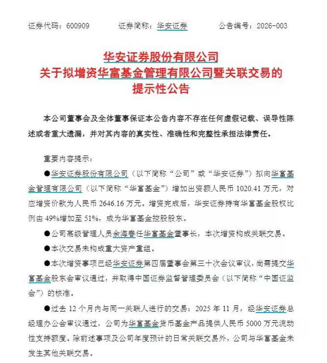 1月12日晚间,华安证券公告称,拟增持华富基金管理有限公司(以下简称华富基金)2%股权,增资价款为2646.16万元。若本次增资能够获批,华安证券将拥有华富基金51%股权比例,成为华富基金控股股东。