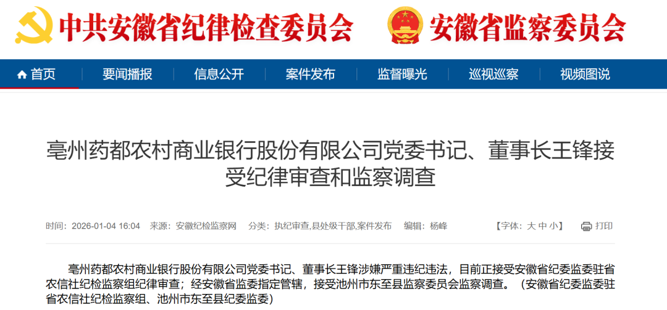 日前,安徽纪检监察网通报称,亳州药都农村商业银行股份有限公司党委书记、董事长王锋涉嫌严重违纪违法,目前正接受安徽省纪委监委驻省农信社纪检监察组纪律审查;经安徽省监委指定管辖,接受池州市东至县监察委员会监察调查。