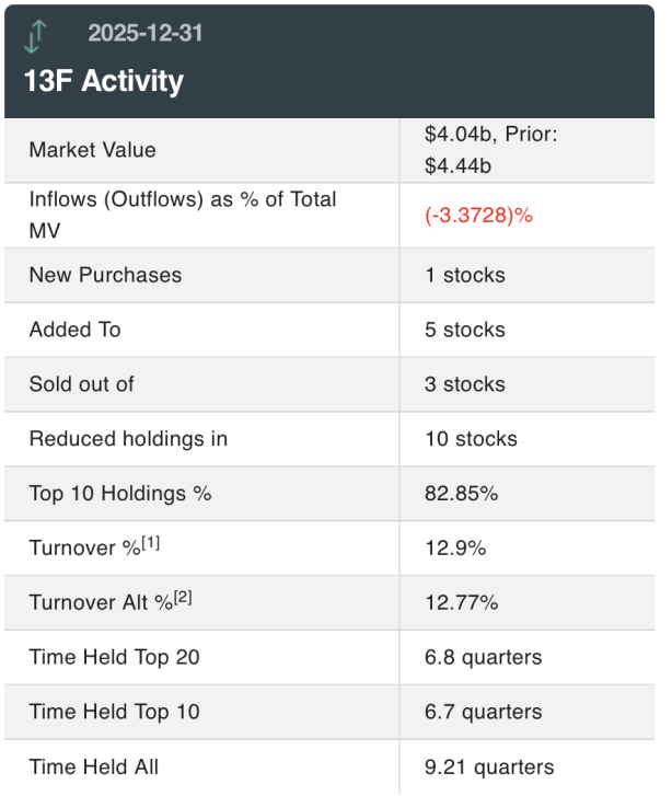 根据13F文件,截至2025年12月31日,景林香港公司四季度末在美股市场合计持仓总市值为40.45亿美元,较三季度末的44.41亿美元下降了8.92%。