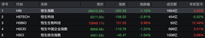 2月20日,春节假期后港股第一个交易日,港股三大指数集体大跌。其中,恒生指数收跌1.10%,报26413.35点;恒生国企指数收跌1.22%, 报8959.56点; 恒生科技收跌2.91%,报5211.50点。不过,恒生生物科技指数逆市收涨0.96%。全日大市成交额为1654亿港元。